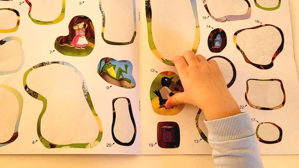 Харесва ми, че стикерите са с различен размер – малки и големи. Така някои са по-лесни, а други по-трудни за отлепване и залепване. Това е хубаво упражнение за фината моторика на децата. Дава възможност както за съвместно четене и лепене с родителите, така и за самостоятелно занимание. Намирането на правилното място на всеки стикер е чудесно за развиване на логическото мислене на децата.