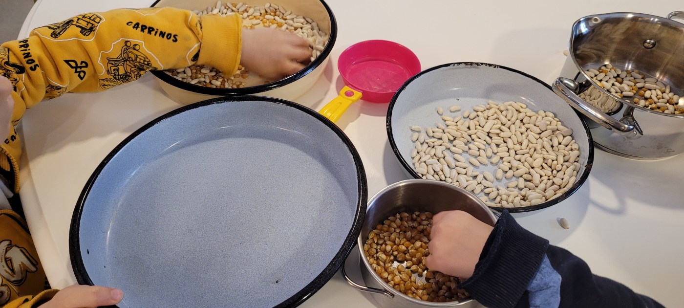 Това занимание е класика в подхода на Мария Монтесори. Аз понякога тайничко се чудя дали мащехата на Пепеляшка е била толкова лоша или просто е настоявала да се изчисти след играта…Заниманието гарантирано ще увлече малките деца и е много подходящо за развитието на фината моторика. Обмислете какви количества и от колко вида да ползвате, за да Ви е лесно, ако децата се откажат, преди да ги разделят. Играта предполага опасност от поглъщане или задавяне, затова наблюдавайте децата.