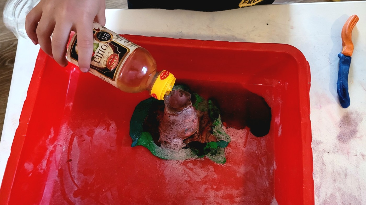 Първата стъпка е заедно с децата да направите формата на вулкана и да я закрепите. После децата изсипват вътре содата евентуално смесена с оцветител. След това въоръжавате децата с малко шишенце оцет и „изригването“ започва.