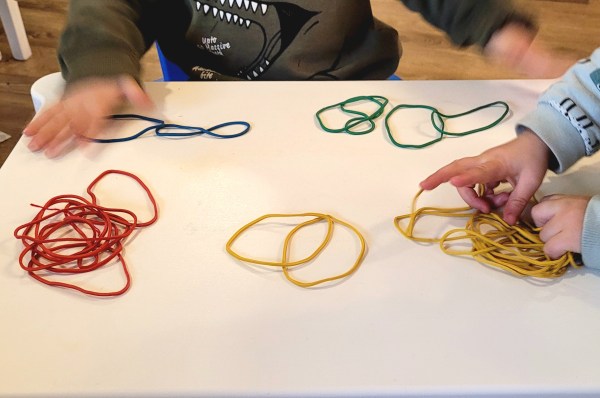 Ако сте си мечтали за нещо достатъчно дребно за трениране на финната моторика, но да не Ви боли, когато го настъпите, ето го решението - най-обикновени големи ластици. При големите ластици рискът от задавяне или възпиране на потока кръв към някой пръст е минимален. Същевременно са достатъчно тънки, че хлапетата да си развиват пинсетния захват.... Continue Reading →